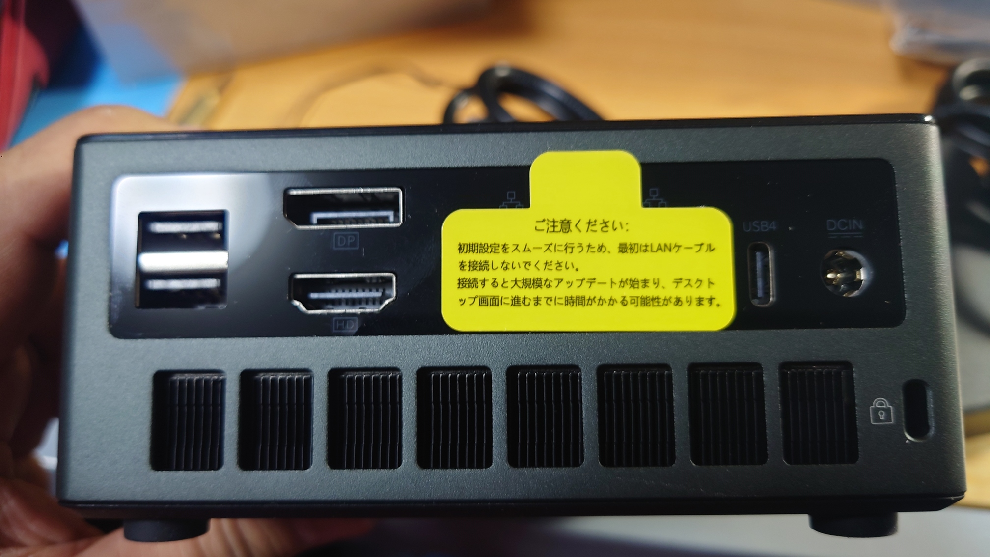 初回起動時、親切にもNICのところにLANケーブルをつなげると初期セットアップ時に大量のダウンロードが始まり時間がかかるという注意書きシールがあり塞がれているという状態。